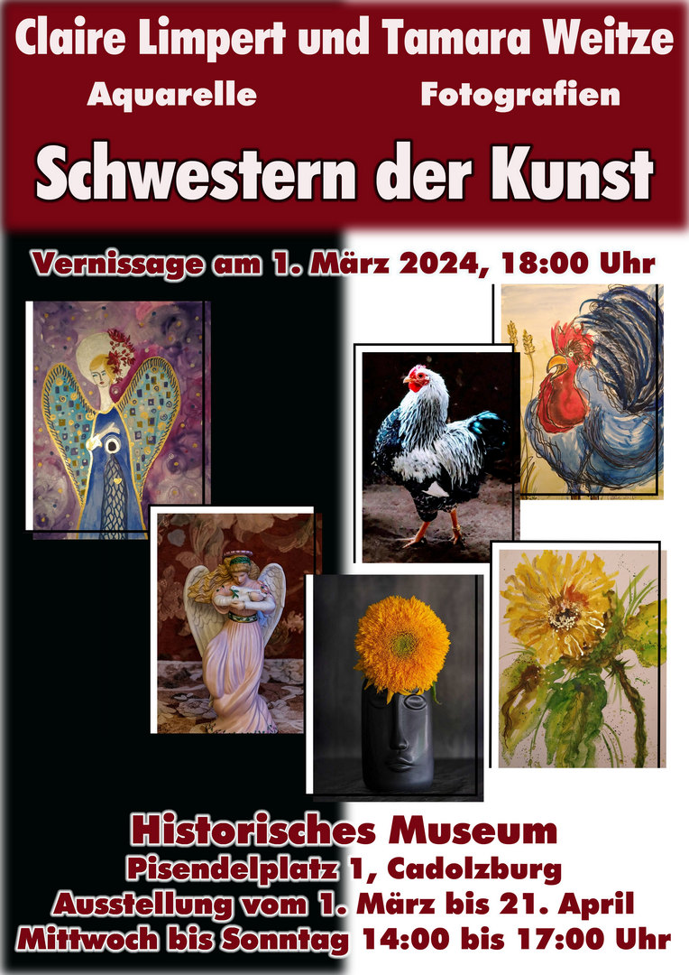 Unser Mitglied Tamara Weitze hat am 01.03.2024 um 18 Uhr ihre Vernissage zur Ausstellung „Schwestern der Kunst“ im Historischen Museum, Pisendelplatz 1, 90556 Cadolzburg. Mitglieder sind herzlich dazu eingeladen. Tamara (Fotografien) und Claire Limpert (Aquarelle) stellen gemeinsam aus. Die Ausstellung endet am 21.04.2024. Die Öffnungszeiten entnehmt ihr dem Bild.